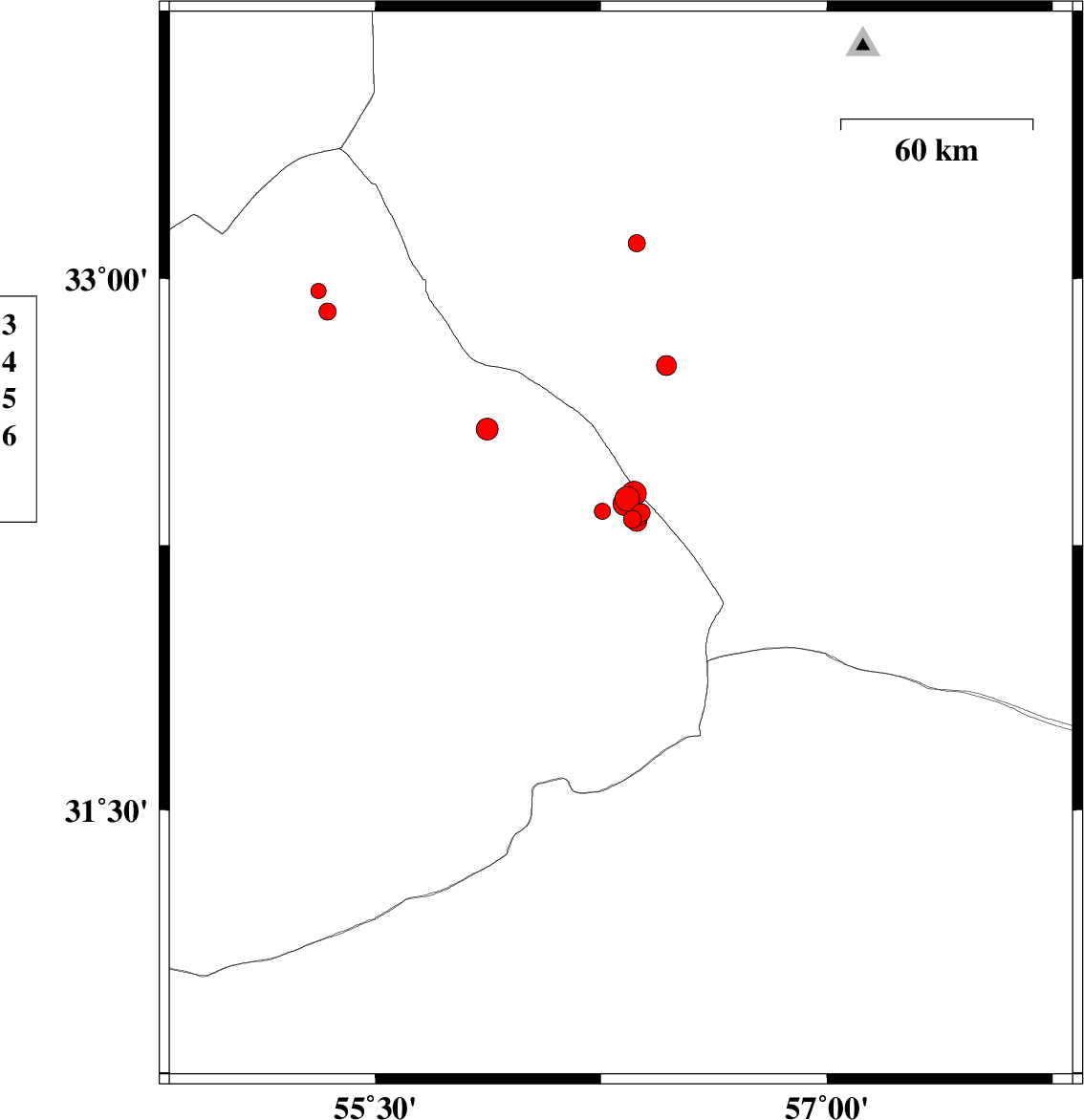 2018/06/11 | 08:04:54.1 | 12:34:54.1 | 31.406 | 56.314 | 17 | ML:2.2 | Kerman Province, 50 km North-West of Ravar | ||
