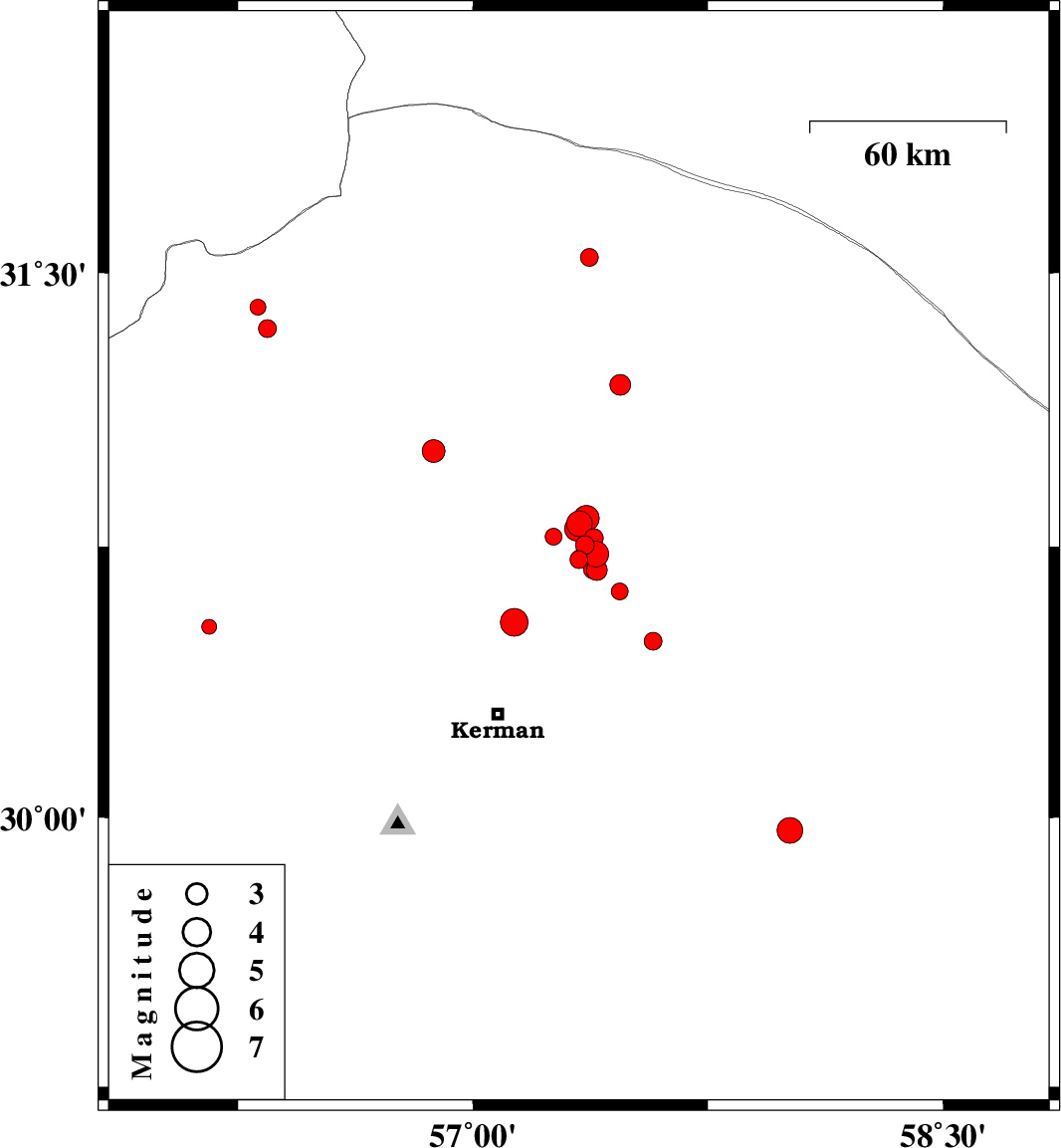 2018/06/11 | 09:58:01.1 | 14:28:01.1 | 30.626 | 57.469 | 14 | ML:2.4 | Kerman Province, 53 km North-East of Kerman | ||