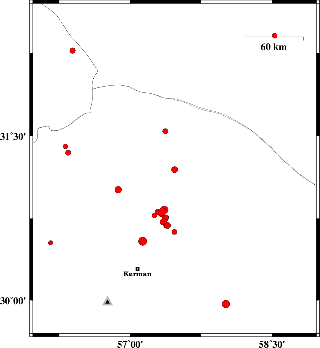 2018/06/11 | 09:58:01.1 | 14:28:01.1 | 30.626 | 57.469 | 14 | ML:2.4 | Kerman Province, 53 km North-East of Kerman | ||