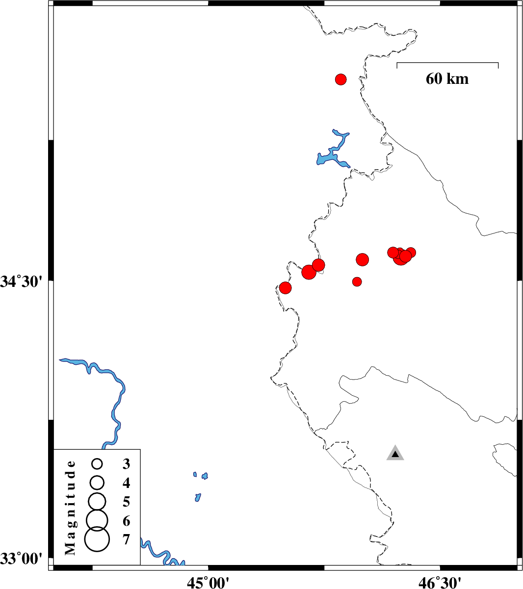 2018/06/26 | 22:22:09.2 | 02:52:09.2 | 34.583 | 45.712 | 17 | ML:3.6 | Iraq, 14 km -East of Qasr-E-Shirin | ||