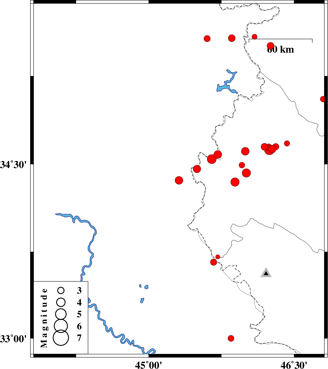 2018/07/05 | 17:16:51.8 | 21:46:51.8 | 34.363 | 45.312 | 14 | ML:3.7 | Iraq, 30 km South-West of Qasr-E-Shirin | ||