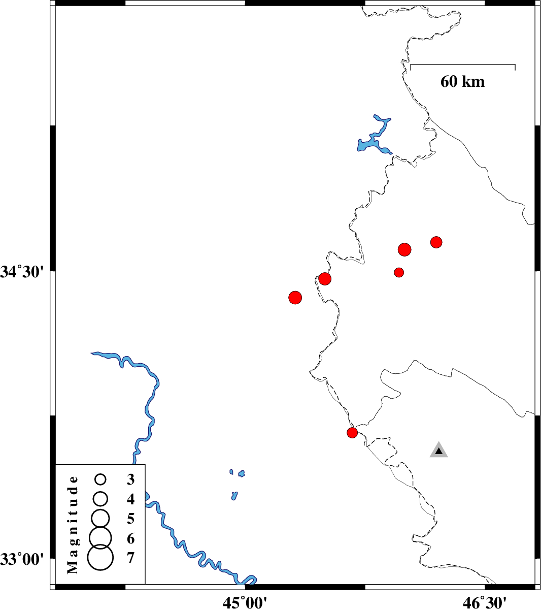 2018/07/05 | 17:16:51.8 | 21:46:51.8 | 34.363 | 45.312 | 14 | ML:3.7 | Iraq, 30 km South-West of Qasr-E-Shirin | ||