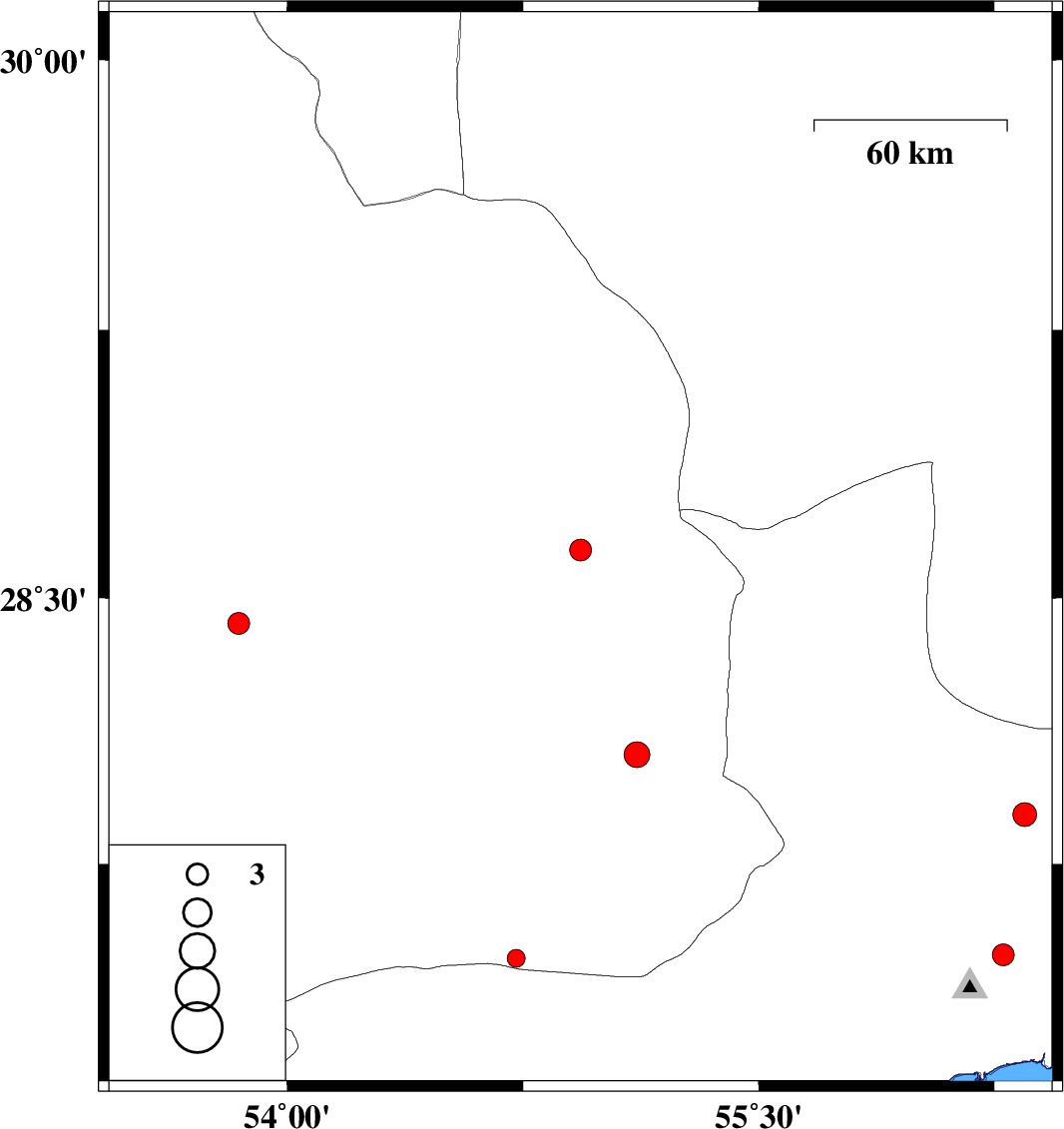 | 2018/07/11 | 02:30:26.7 | 07:00:26.7 | 28.635 | 54.933 | 14 | ML:3.1 | Fars Province, 41 km South-East of Darab | ||