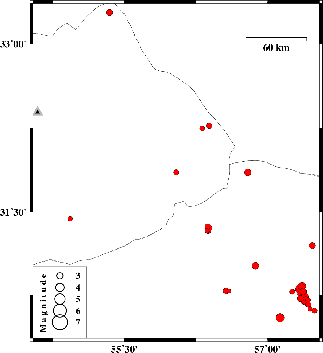 2018/06/29 | 22:55:32.7 | 03:25:32.7 | 30.754 | 57.358 | 14 | ML:2.7 | Kerman Province, 58 km North-East of Kerman | ||