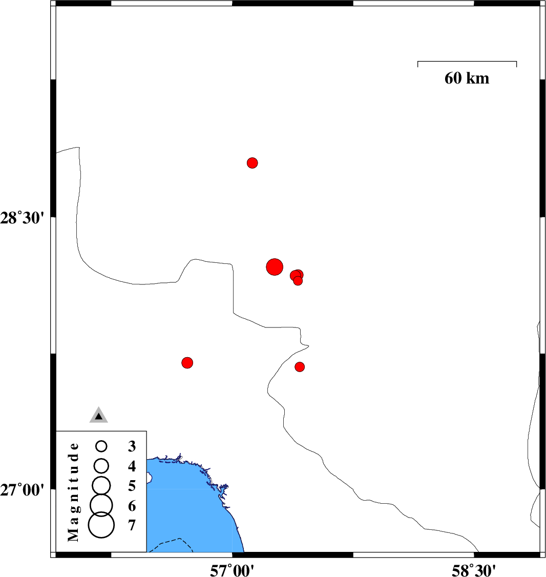 2018/07/13 | 09:03:25.4 | 13:33:25.4 | 28.227 | 57.262 | 14 | ML:4.6 | Kerman Province, 52 km North-West of Kahnuj | ||