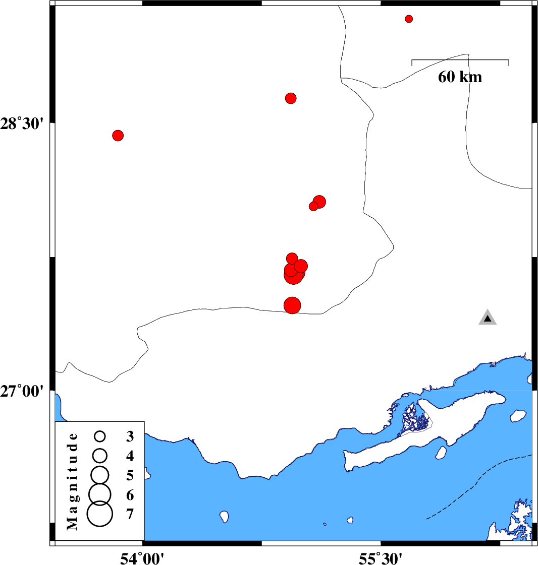 2018/07/21 | 18:24:13.9 | 22:54:13.9 | 28.033 | 55.076 | 6 | ML:2.6 | Fars Province, 82 km North-East of Lar | ||
