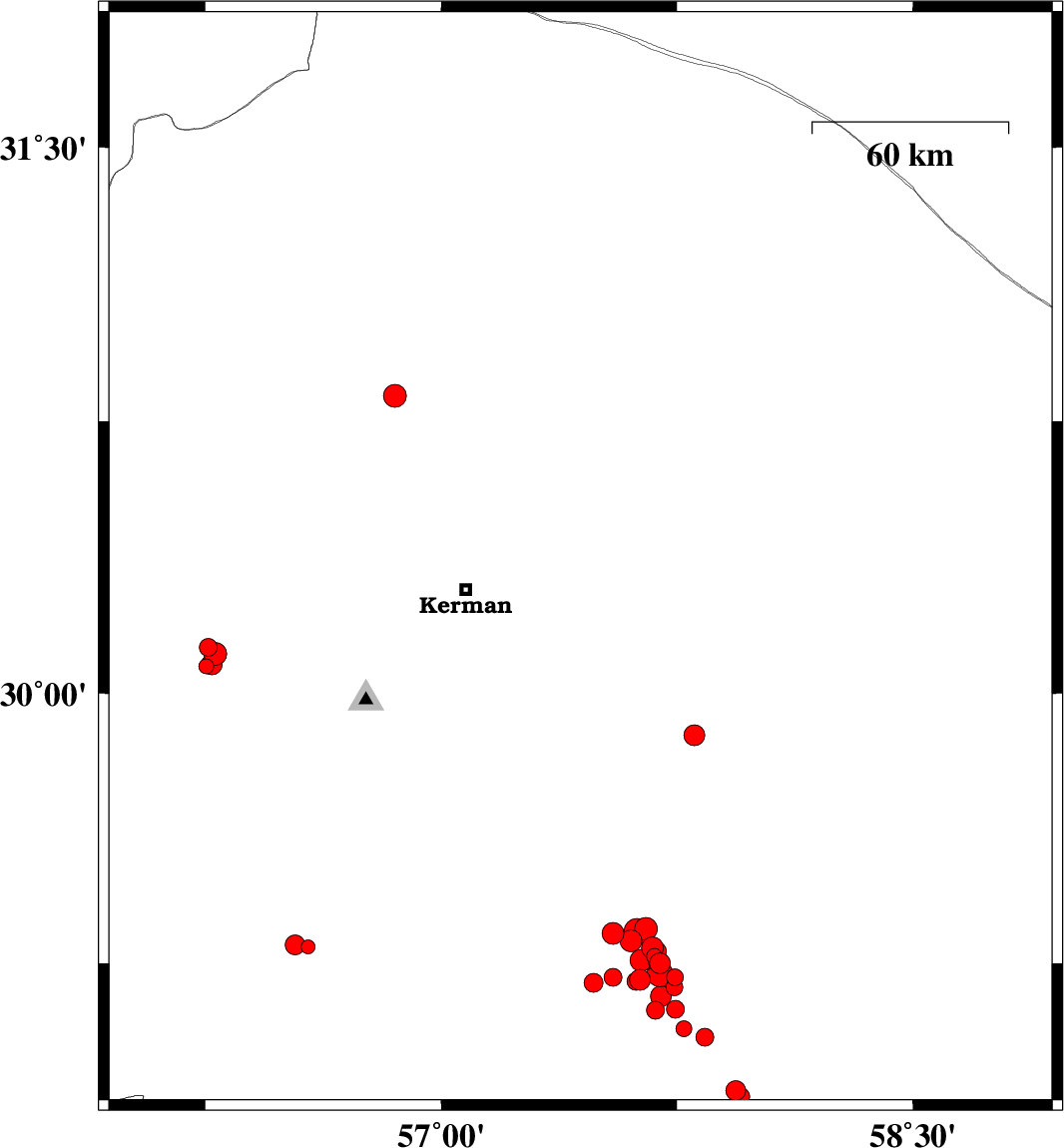 2018/06/29 | 22:55:32.7 | 03:25:32.7 | 30.754 | 57.358 | 14 | ML:2.7 | Kerman Province, 58 km North-East of Kerman | ||