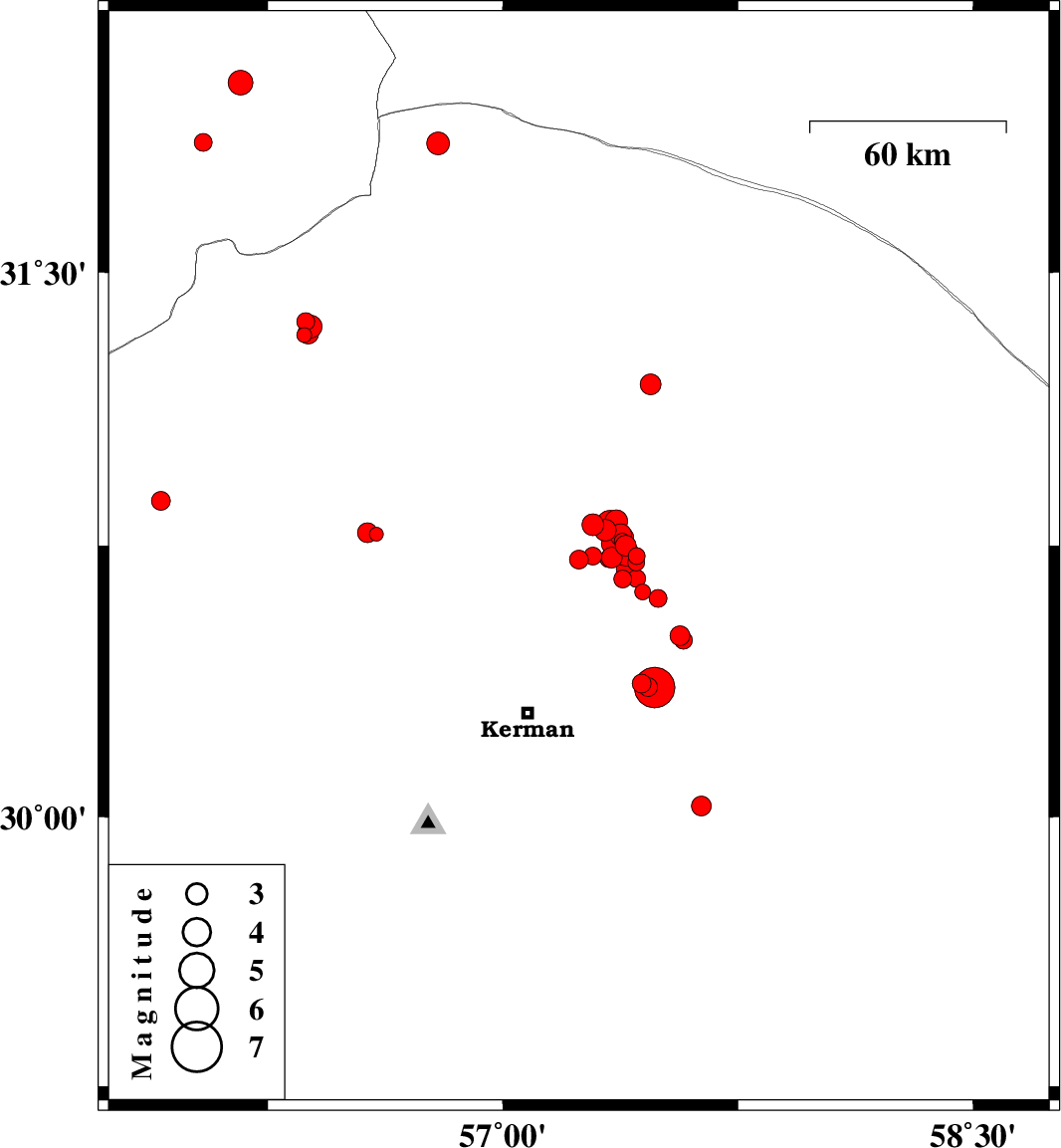 2018/06/29 | 22:55:32.7 | 03:25:32.7 | 30.754 | 57.358 | 14 | ML:2.7 | Kerman Province, 58 km North-East of Kerman | ||