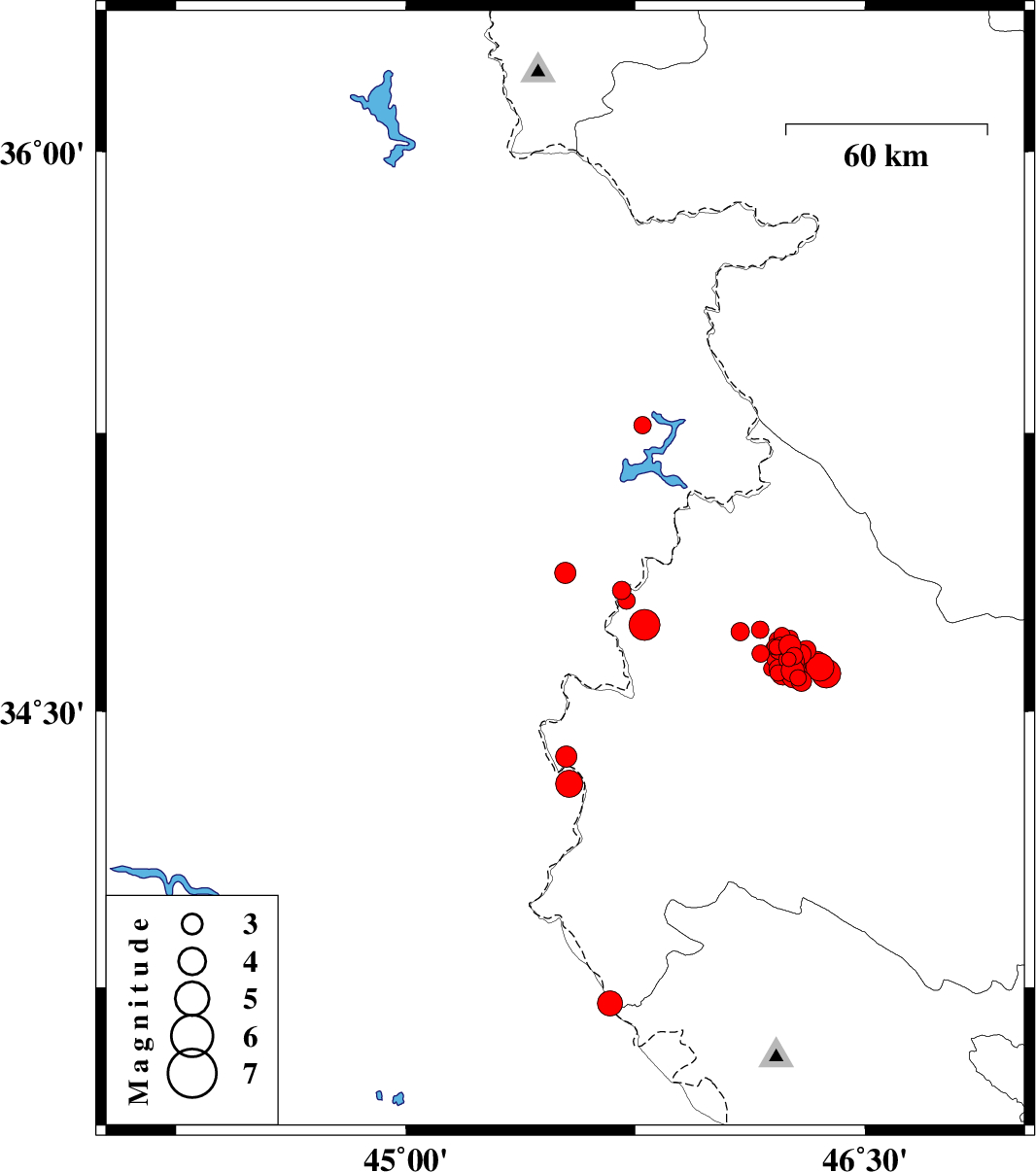 2018/07/30 | 03:02:57.7 | 07:32:57.7 | 34.677 | 46.254 | 6 | ML:3.2 | Kermanshah Province, 25 km South-West of Javanrud | ||