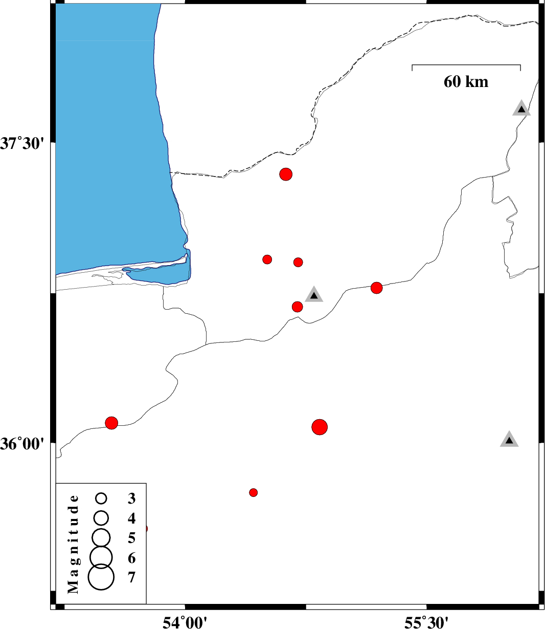 | 2018/07/11 | 04:29:59.2 | 08:59:59.2 | 37.341 | 54.625 | 14 | ML:3.5 | Golestan Province, 40 km North-East of Aq Qaleh | ||