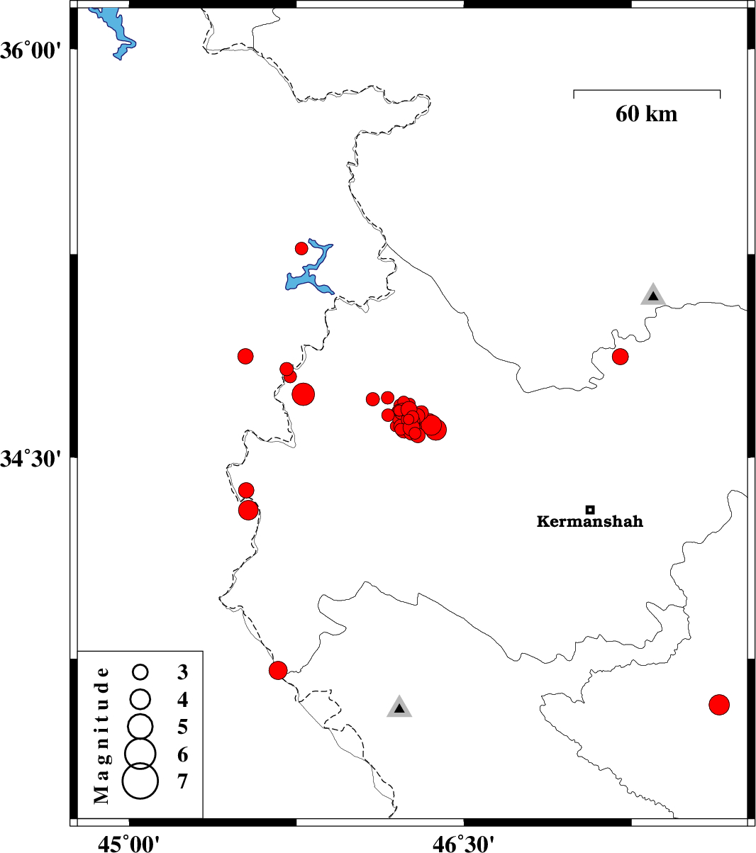 2018/07/30 | 03:02:57.7 | 07:32:57.7 | 34.677 | 46.254 | 6 | ML:3.2 | Kermanshah Province, 25 km South-West of Javanrud | ||