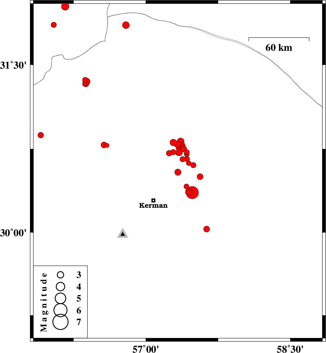 2018/07/31 | 14:13:09.5 | 18:43:09.5 | 30.542 | 57.333 | 14 | ML:3 | Kerman Province, 37 km North-East of Kerman | ||
