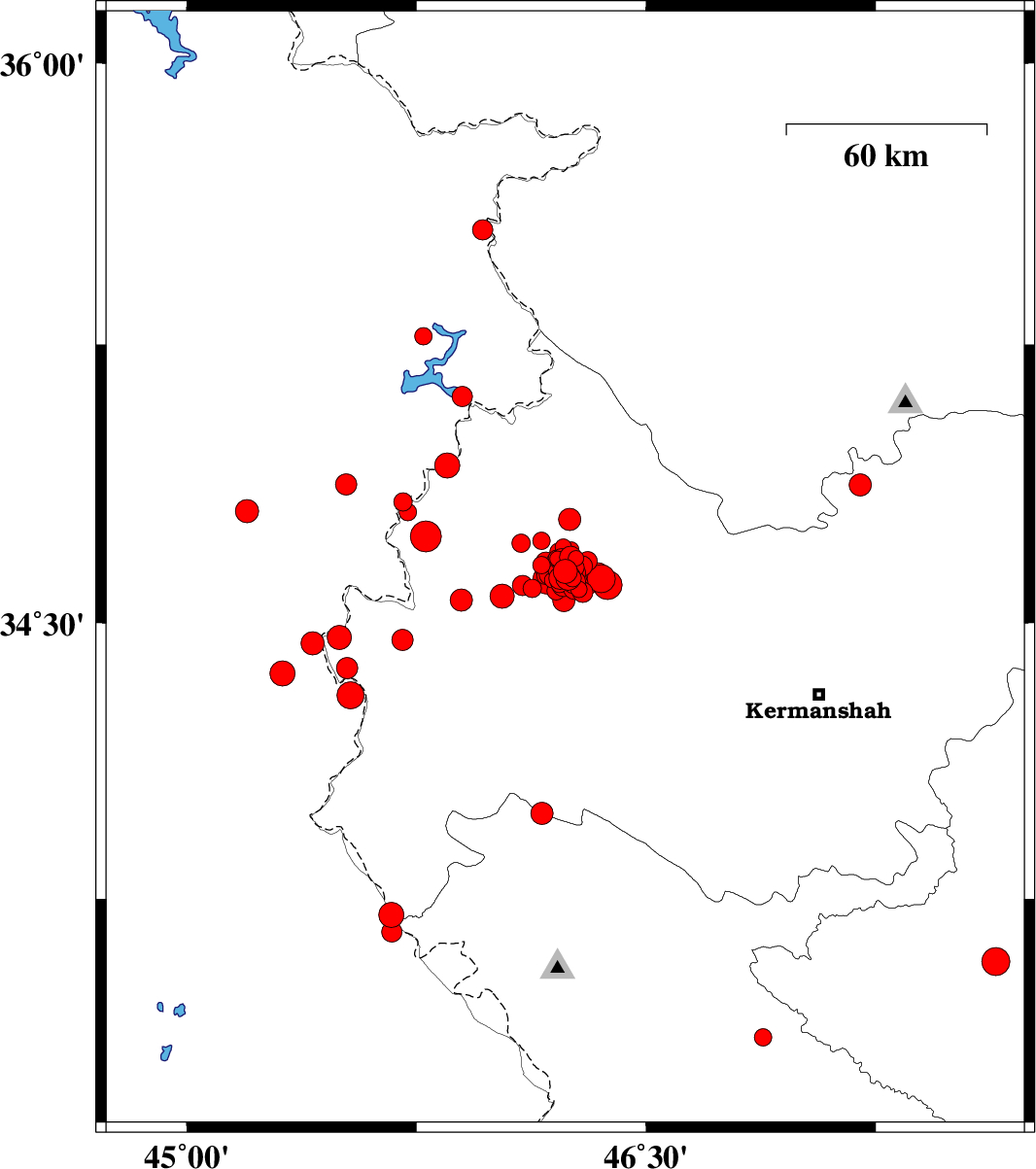 2018/07/30 | 03:02:57.7 | 07:32:57.7 | 34.677 | 46.254 | 6 | ML:3.2 | Kermanshah Province, 25 km South-West of Javanrud | ||