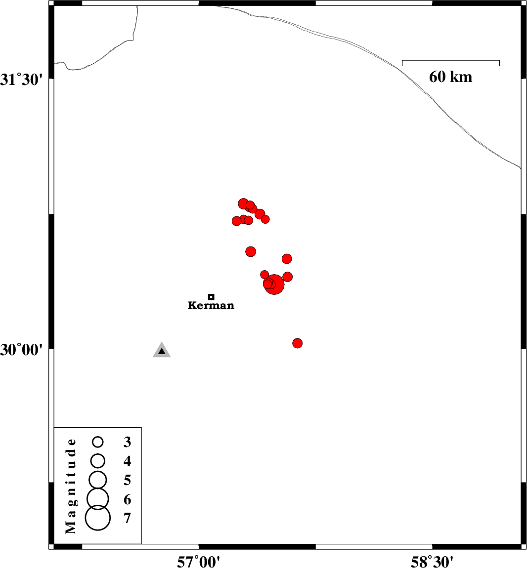 2018/07/31 | 14:13:09.5 | 18:43:09.5 | 30.542 | 57.333 | 14 | ML:3 | Kerman Province, 37 km North-East of Kerman | ||