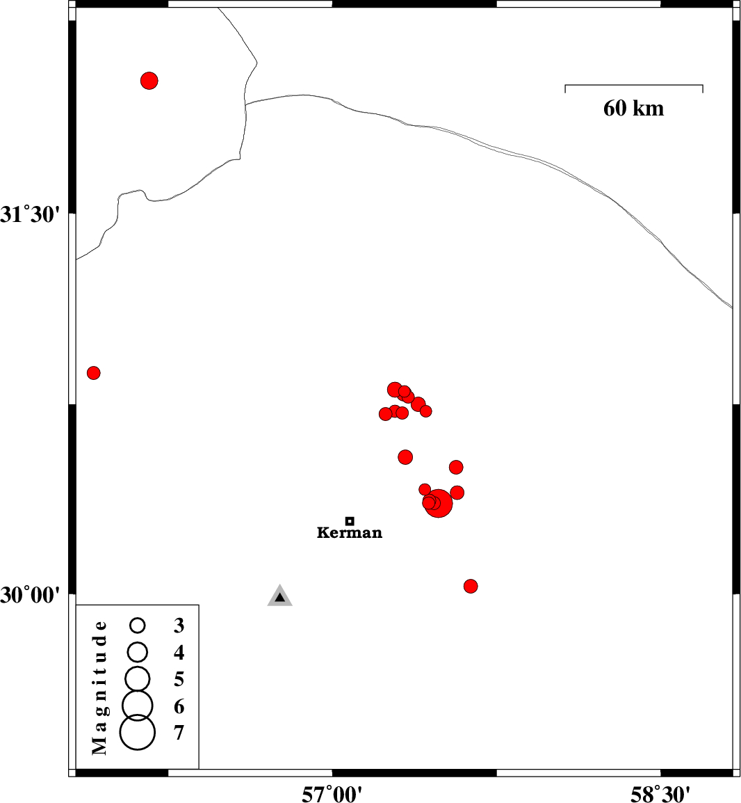 2018/07/31 | 14:13:09.5 | 18:43:09.5 | 30.542 | 57.333 | 14 | ML:3 | Kerman Province, 37 km North-East of Kerman | ||