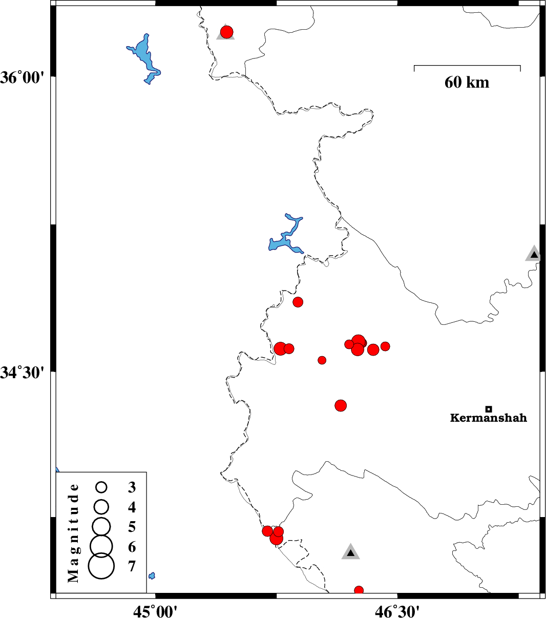 2018/08/15 | 02:32:25.3 | 07:02:25.3 | 34.653 | 46.257 | 6 | ML:3.8 | Kermanshah Province, 26 km South-West of Javanrud | ||