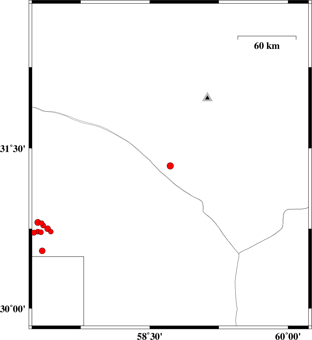 2018/07/31 | 14:13:09.5 | 18:43:09.5 | 30.542 | 57.333 | 14 | ML:3 | Kerman Province, 37 km North-East of Kerman | ||