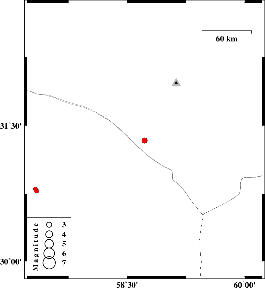 | 2018/08/16 | 05:06:49.9 | 09:36:49.9 | 31.336 | 58.722 | 14 | ML:3.2 | Khorasan(south) Province, 127 km South-West of Nehbandan | ||