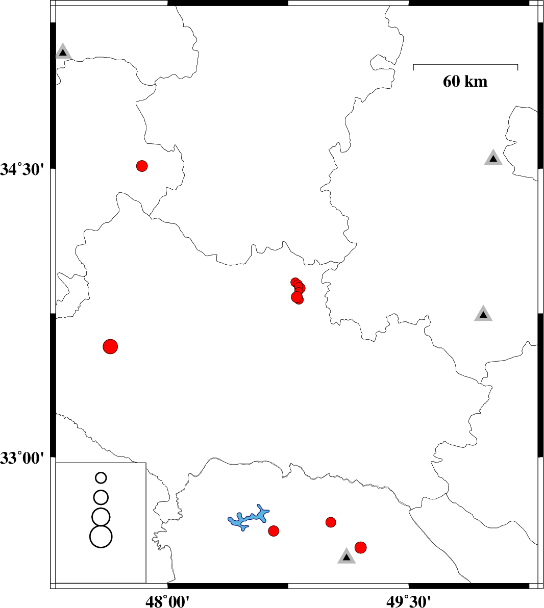 2018/08/19 | 05:30:57.2 | 10:00:57.2 | 33.822 | 48.816 | 14 | ML:2.6 | Lorestan Province, 10 km of Borujerd | ||