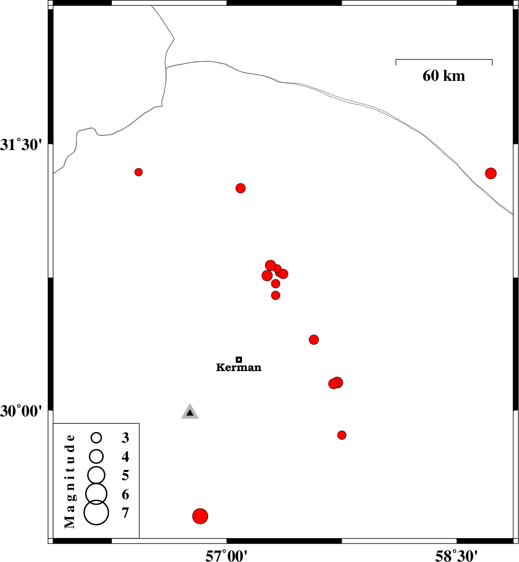 2018/09/01 | 00:27:01.1 | 04:57:01.1 | 29.86 | 57.75 | 14 | ML:2.5 | Kerman Province, 80 km South-East of Kerman | ||
