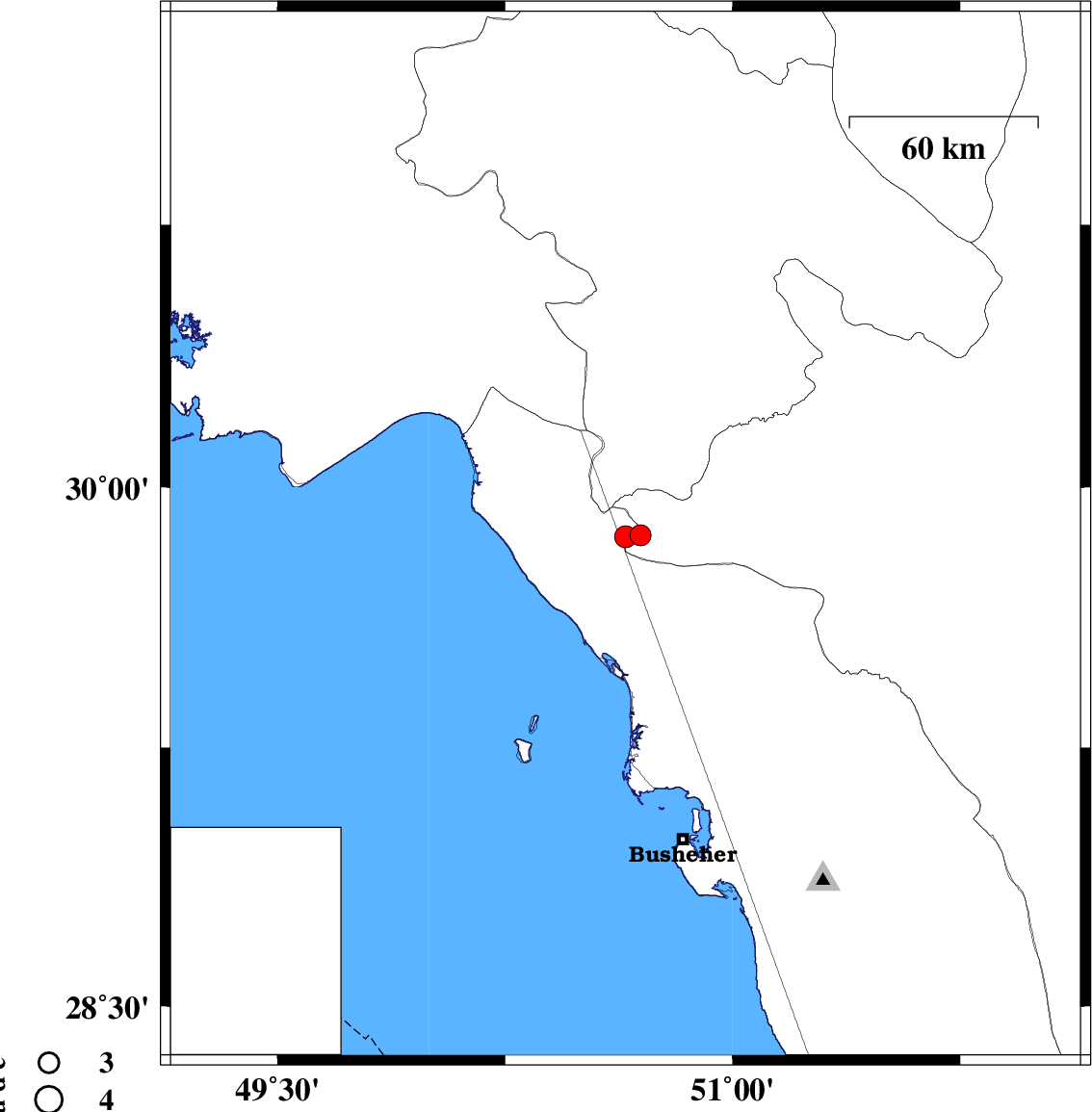 2018/09/10 | 12:35:26.3 | 17:05:26.3 | 29.858 | 50.647 | 6 | ML:3.2 | Bushehr Province, 34 km North-East of Bandar-e genaveh |