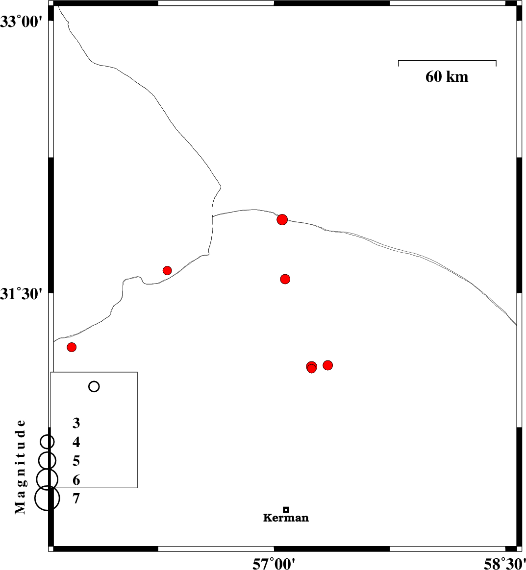 2018/09/04 | 17:35:42.3 | 22:05:42.3 | 30.771 | 57.368 | 14 | ML:2.8 | Kerman Province, 60 km North-East of Kerman | ||