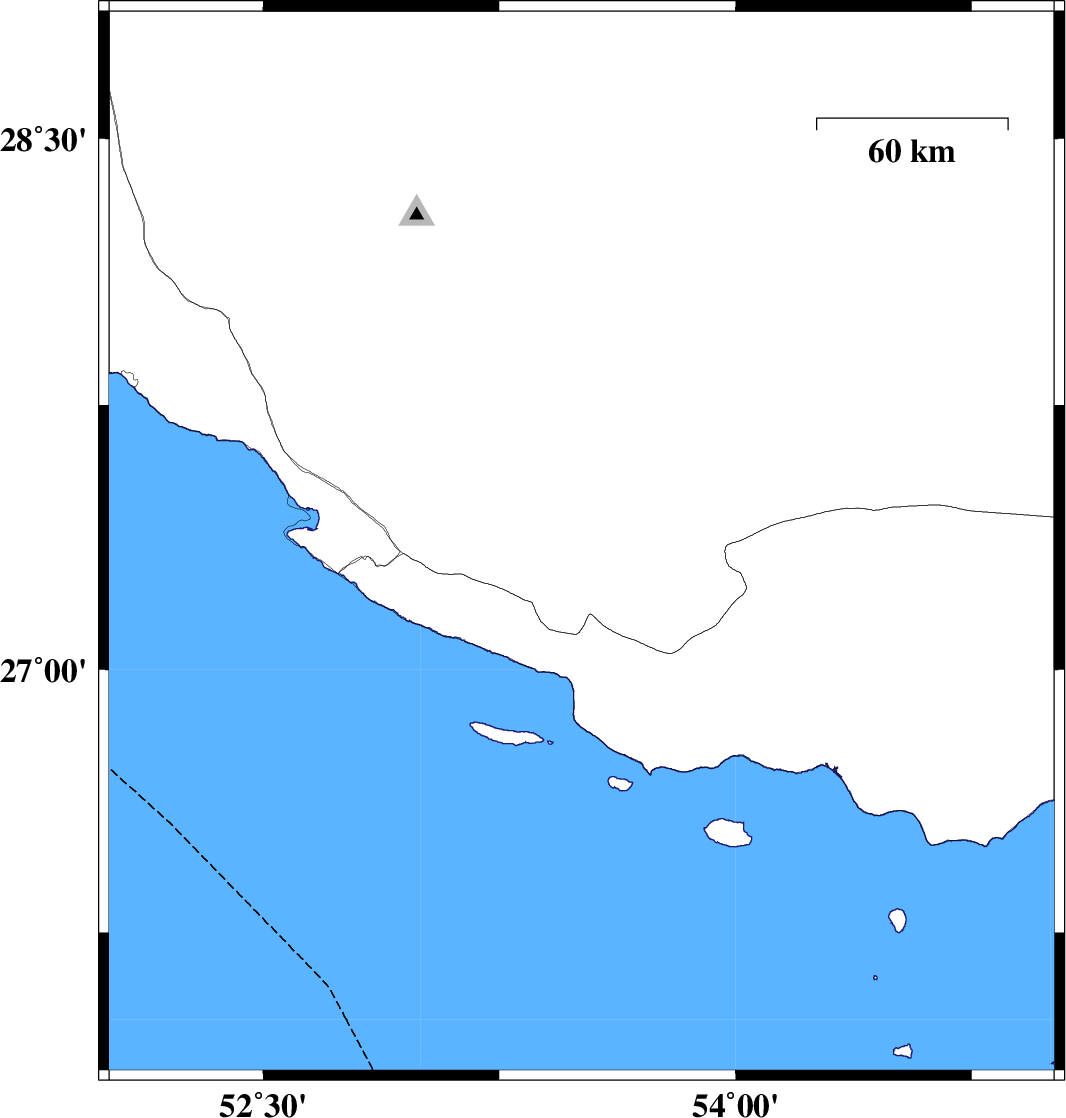 2018/08/24 | 18:18:42.8 | 22:48:42.8 | 27.041 | 54.257 | 15 | ML:3.8 | Hormozgan Province, 20 km South-West of Bastak | ||