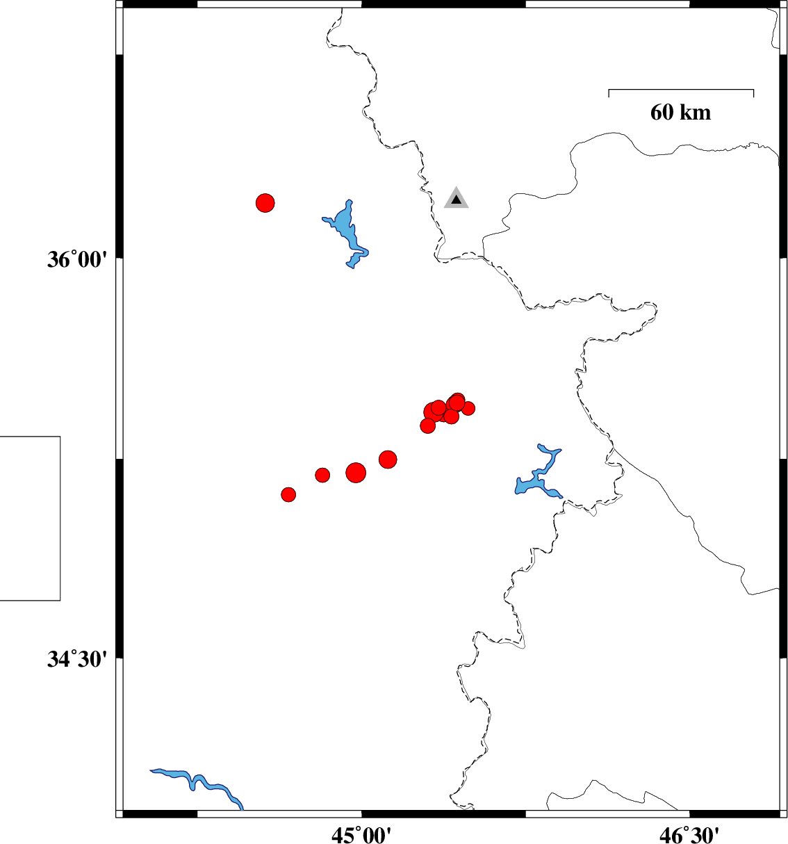 2018/09/10 | 02:29:58.5 | 06:59:58.5 | 34.635 | 46.169 | 15 | ML:3 | Kermanshah Province, 32 km North-East of Sar-e pol-e zahab | ||