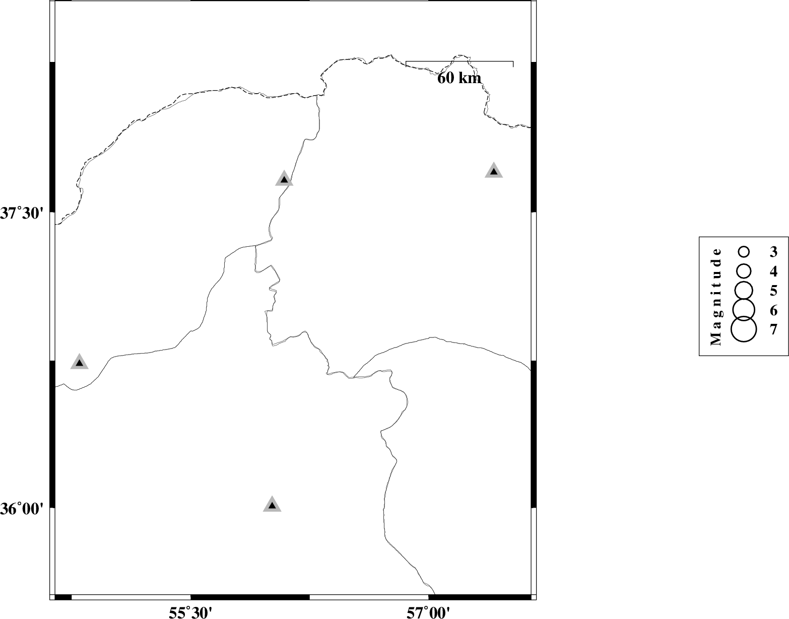 | 2018/09/21 | 18:36:29.5 | 23:06:29.5 | 37.054 | 56.145 | 7 | ML:3 | Khorasan(north) Province, 25 km North-West of Jajarm |