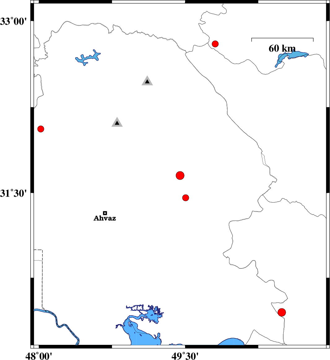 | 2018/08/27 | 23:45:57.5 | 04:15:57.5 | 32.06 | 48.02 | 15 | ML:2.9 | Khoozestan Province, 27 km South-West of Shush |