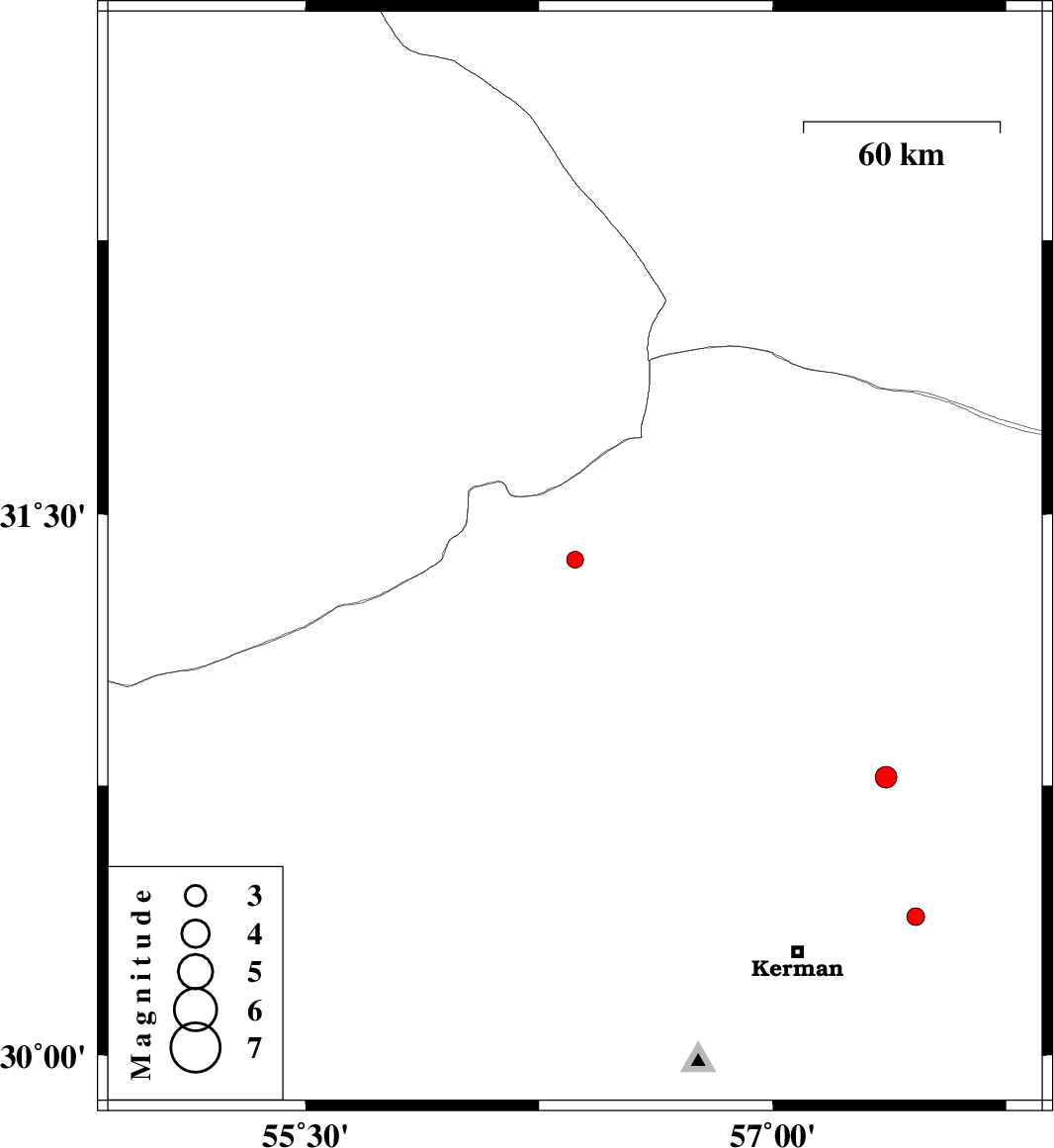 2018/09/25 | 22:37:00.2 | 02:07:00.2 | 30.386 | 57.459 | 14 | ML:2.6 | Kerman Province, 38 km -East of Kerman | ||