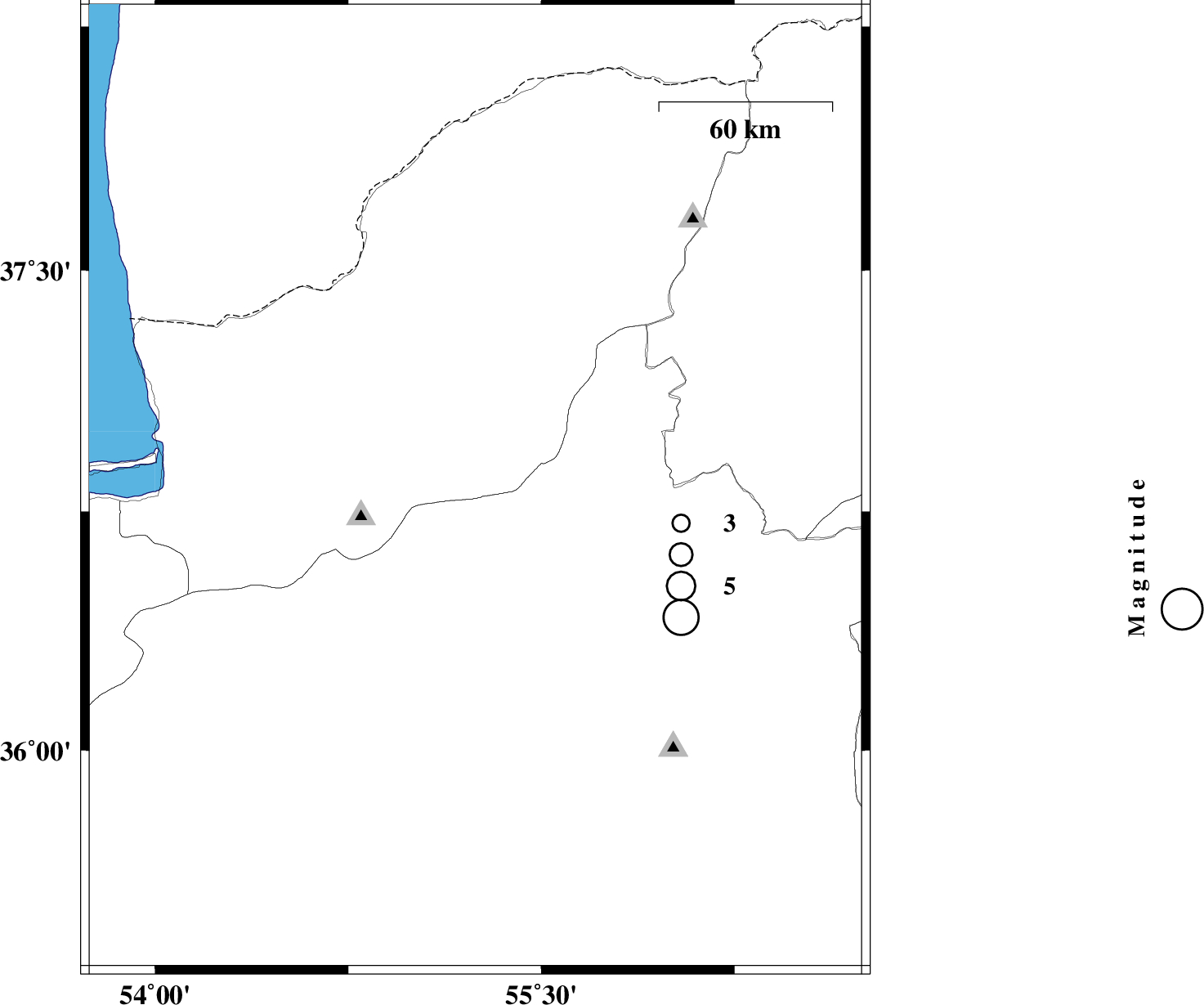 | 2018/09/25 | 14:32:41.8 | 18:02:41.8 | 36.819 | 55.244 | 9 | ML:2.4 | Golestan Province, 23 km South of Ramian | ||