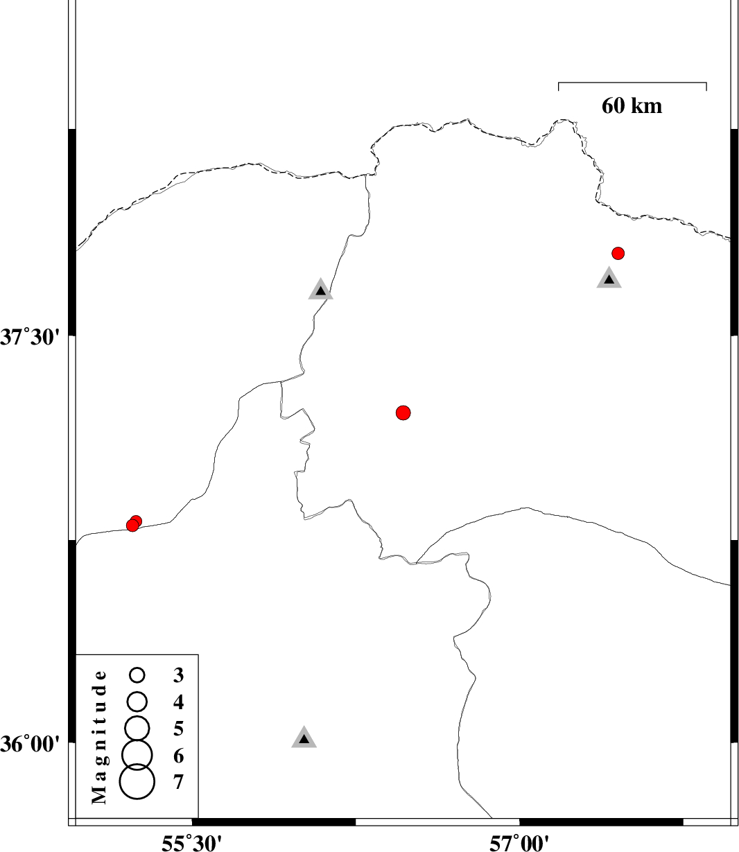 | 2018/09/29 | 03:02:05.2 | 06:32:05.2 | 37.799 | 57.452 | 6 | ML:2.6 | Khorasan(north) Province, 38 km North-East of Bojnurd | ||