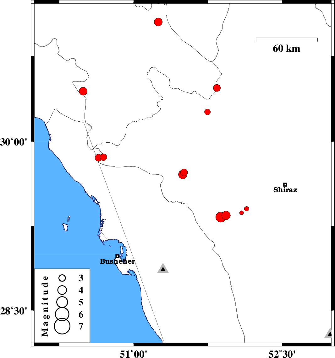 2018/09/23 | 05:22:56.6 | 08:52:56.6 | 29.332 | 51.882 | 15 | ML:4.7 | Fars Province, 39 km South-East of Kazerun | ||