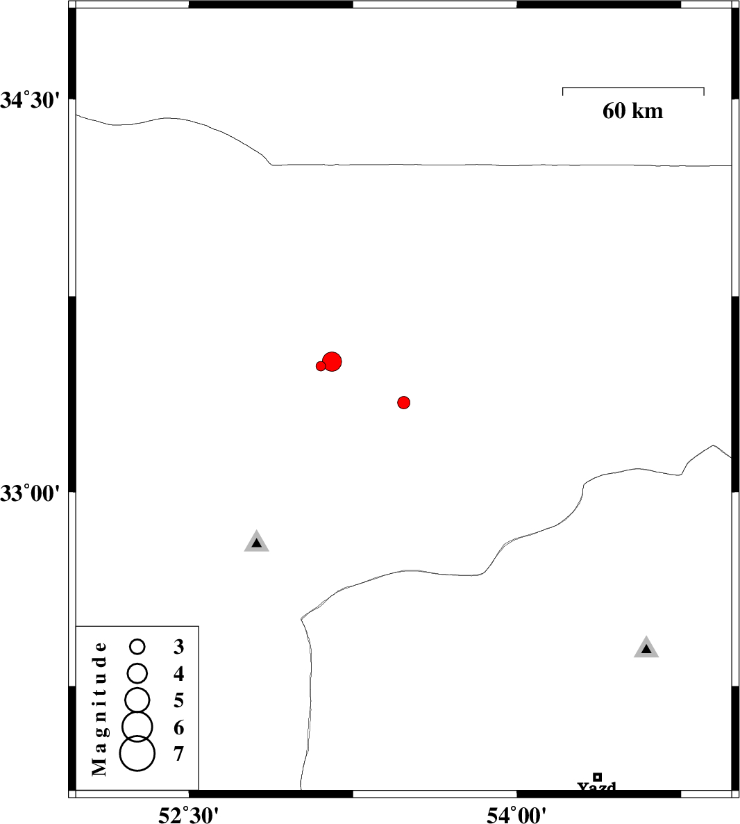 | 2018/09/30 | 03:24:29.5 | 06:54:29.5 | 33.344 | 53.482 | 14 | ML:2.5 | Esfahan Province, 64 km North-East of Nain | ||