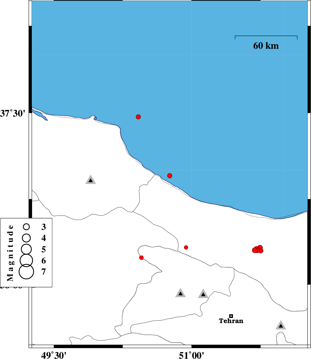 | 2018/10/01 | 03:16:03.2 | 06:46:03.2 | 36.965 | 50.761 | 14 | ML:2.2 | Caspian Sea, 12 km -East of Ramsar | ||