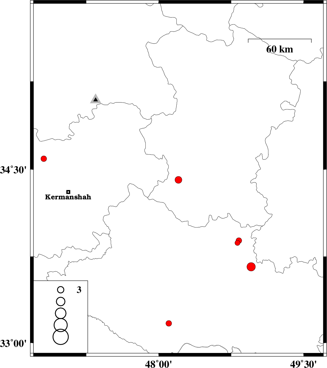 2018/09/24 | 04:42:18.3 | 08:12:18.3 | 34.591 | 46.811 | 15 | ML:2.7 | Kermanshah Province, 28 km South-West of Kamyaran | ||