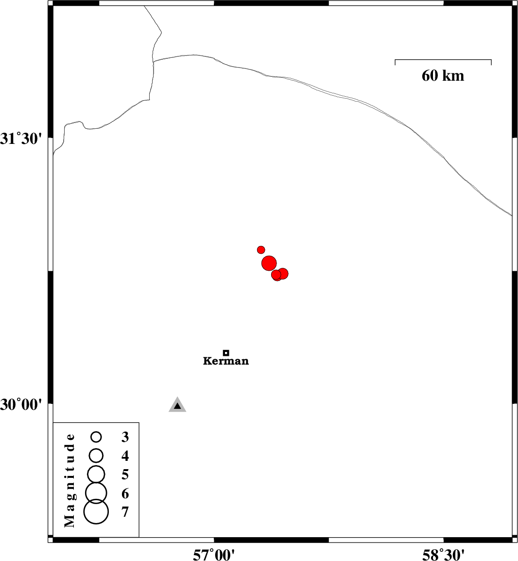 2018/10/03 | 23:53:01.6 | 03:23:01.6 | 30.794 | 57.36 | 14 | ML:4.4 | Kerman Province, 62 km North-East of Kerman | ||