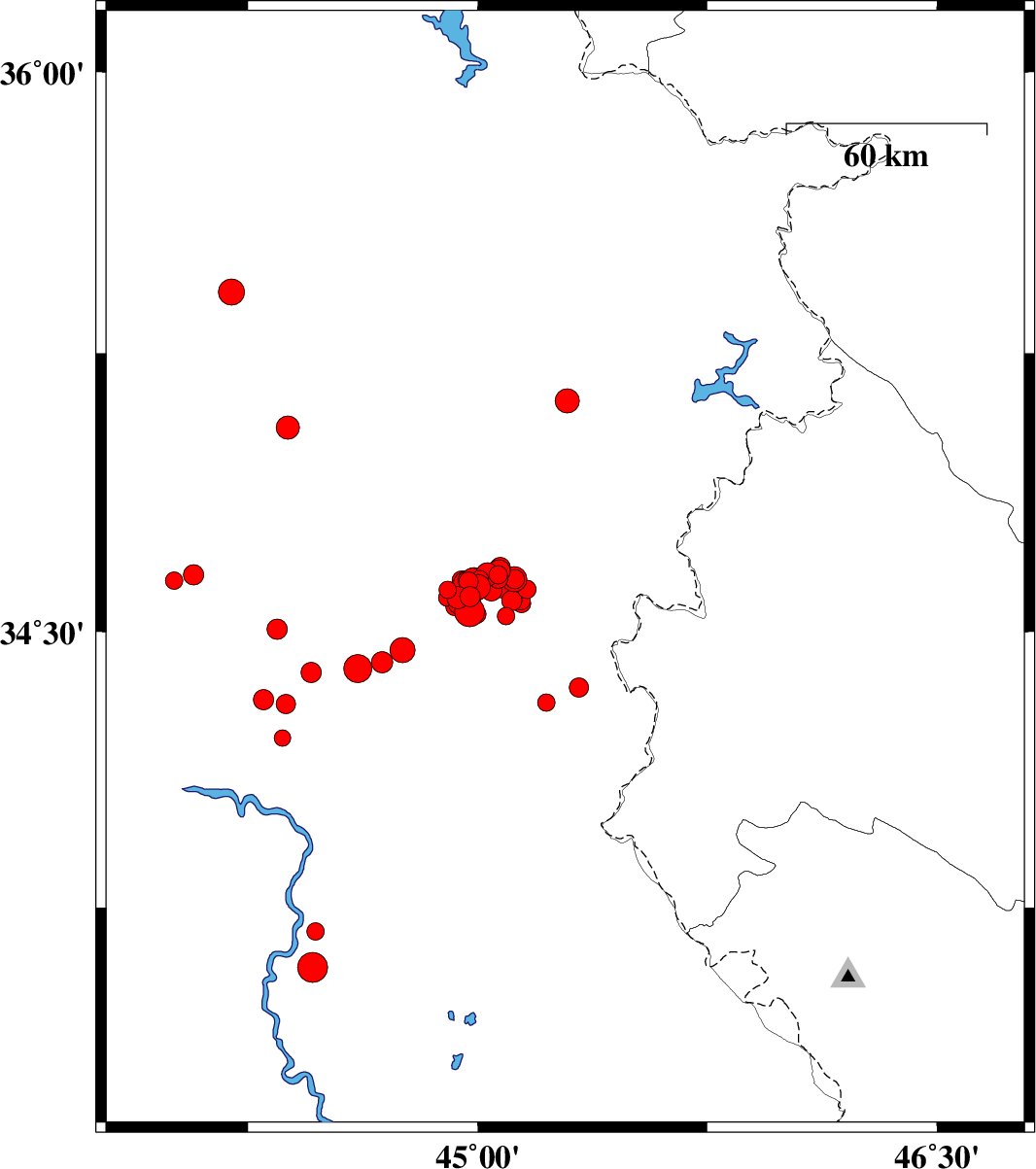 2018/09/30 | 23:49:24.6 | 03:19:24.6 | 34.564 | 46.189 | 15 | ML:4.4 | Kermanshah Province, 30 km -East of Sar-e pol-e zahab | ||