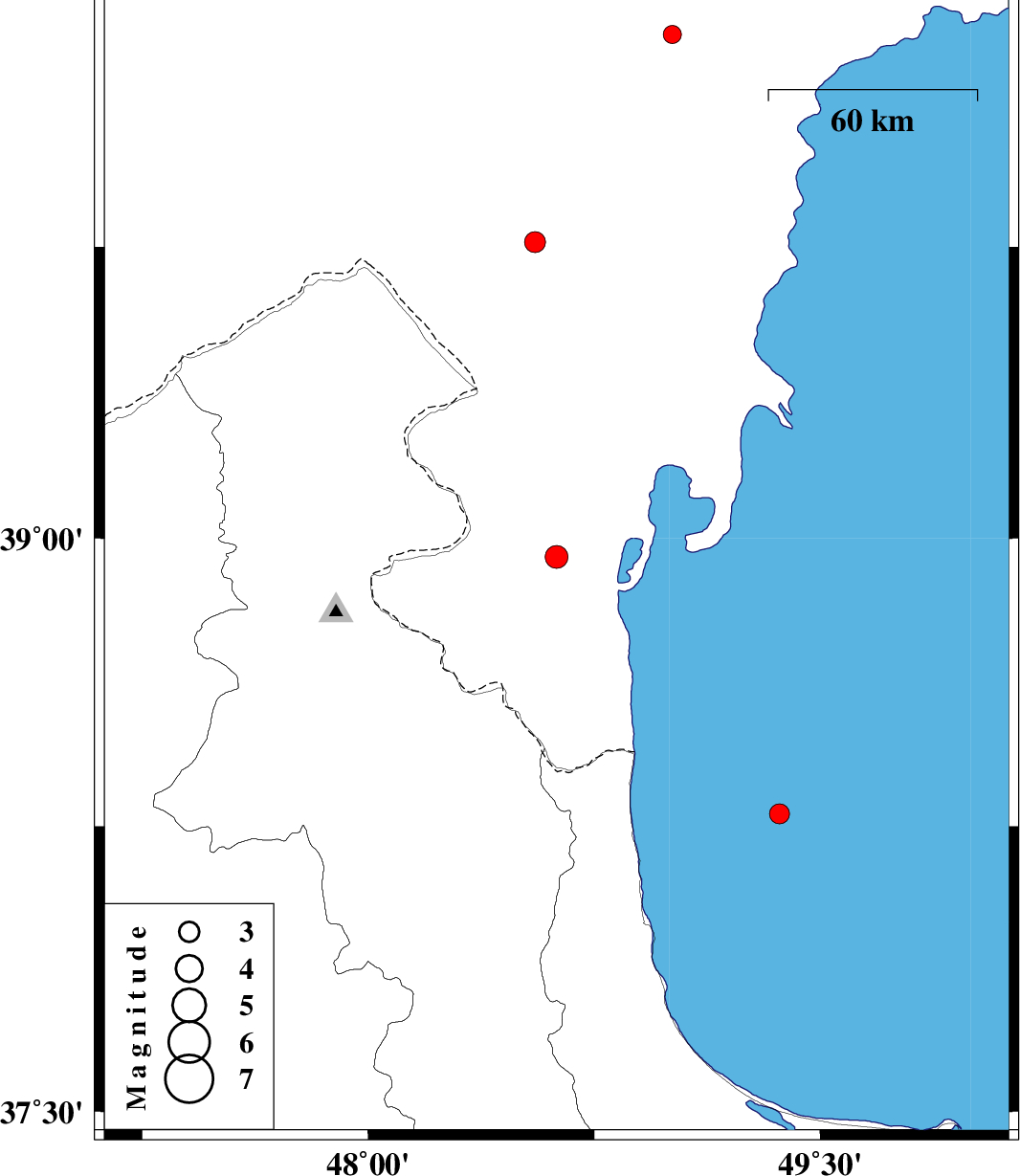 | 2018/10/02 | 12:42:25.1 | 16:12:25.1 | 38.283 | 49.365 | 14 | ML:2.9 | Caspian Sea, 47 km South-East of Astara | ||
