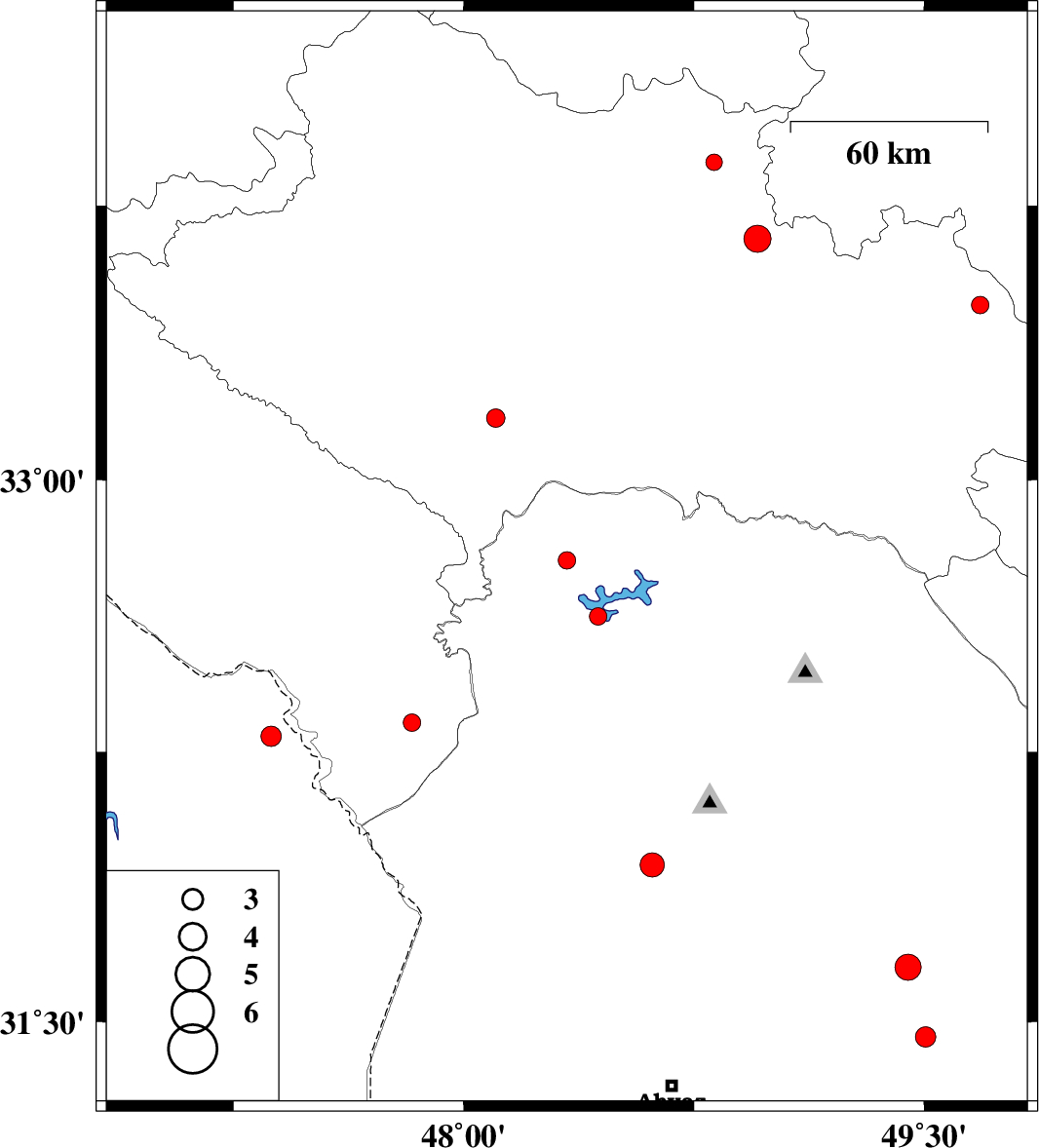 2018/10/01 | 06:16:30.0 | 09:46:30.0 | 33.17 | 48.104 | 14 | ML:2.7 | Lorestan Province, 36 km -East of Pol-e dokhtar | ||