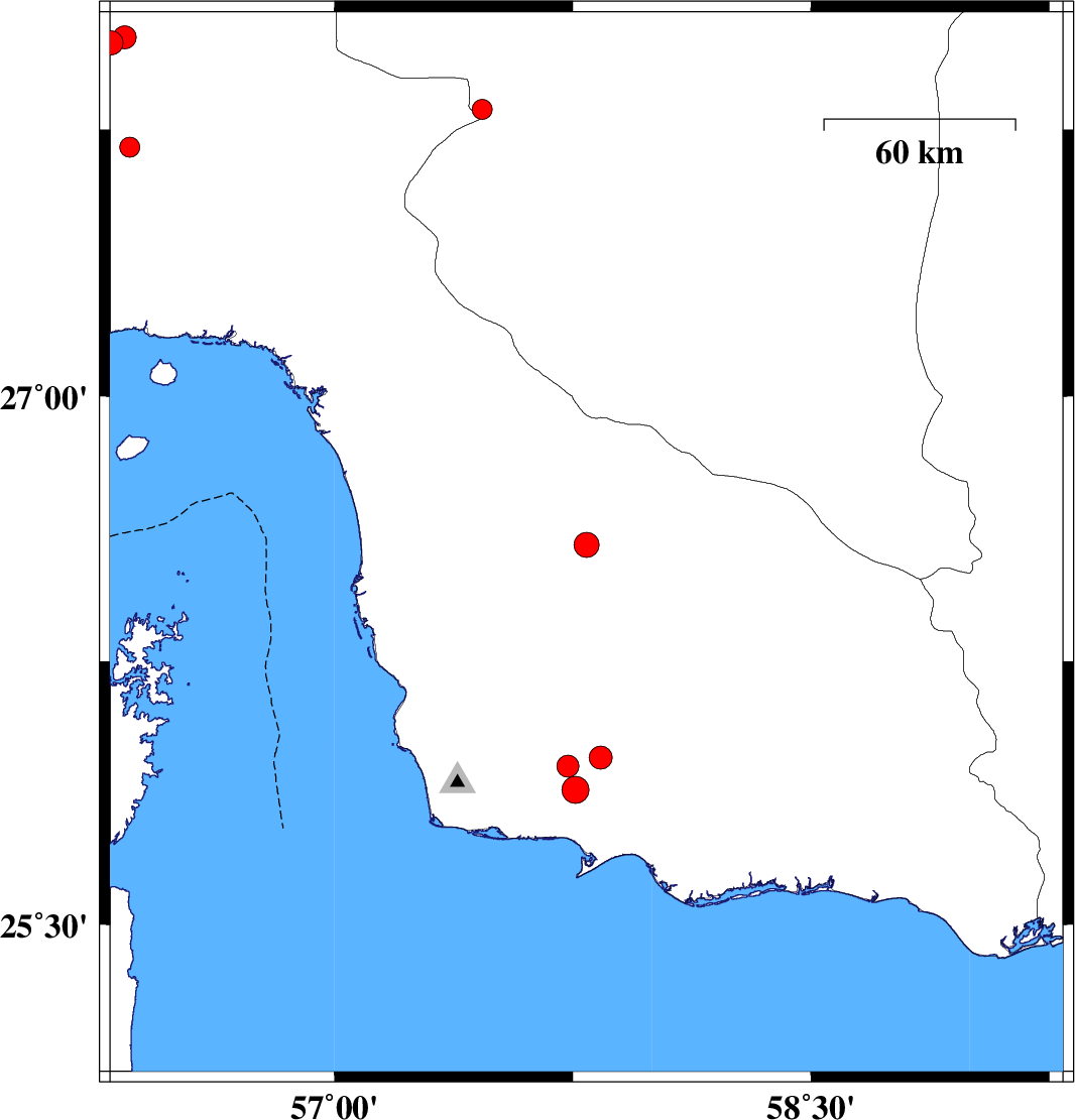 2018/10/09 | 16:58:58.7 | 20:28:58.7 | 27.806 | 57.465 | 15 | ML:2.8 | Kerman Province, 28 km South-West of Kahnuj | ||