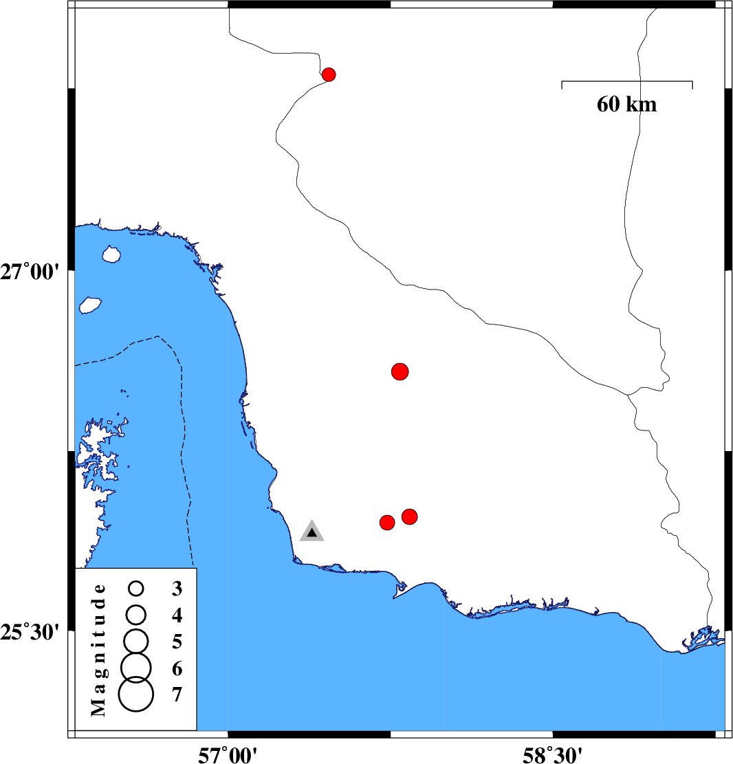 2018/10/09 | 16:58:58.7 | 20:28:58.7 | 27.806 | 57.465 | 15 | ML:2.8 | Kerman Province, 28 km South-West of Kahnuj | ||