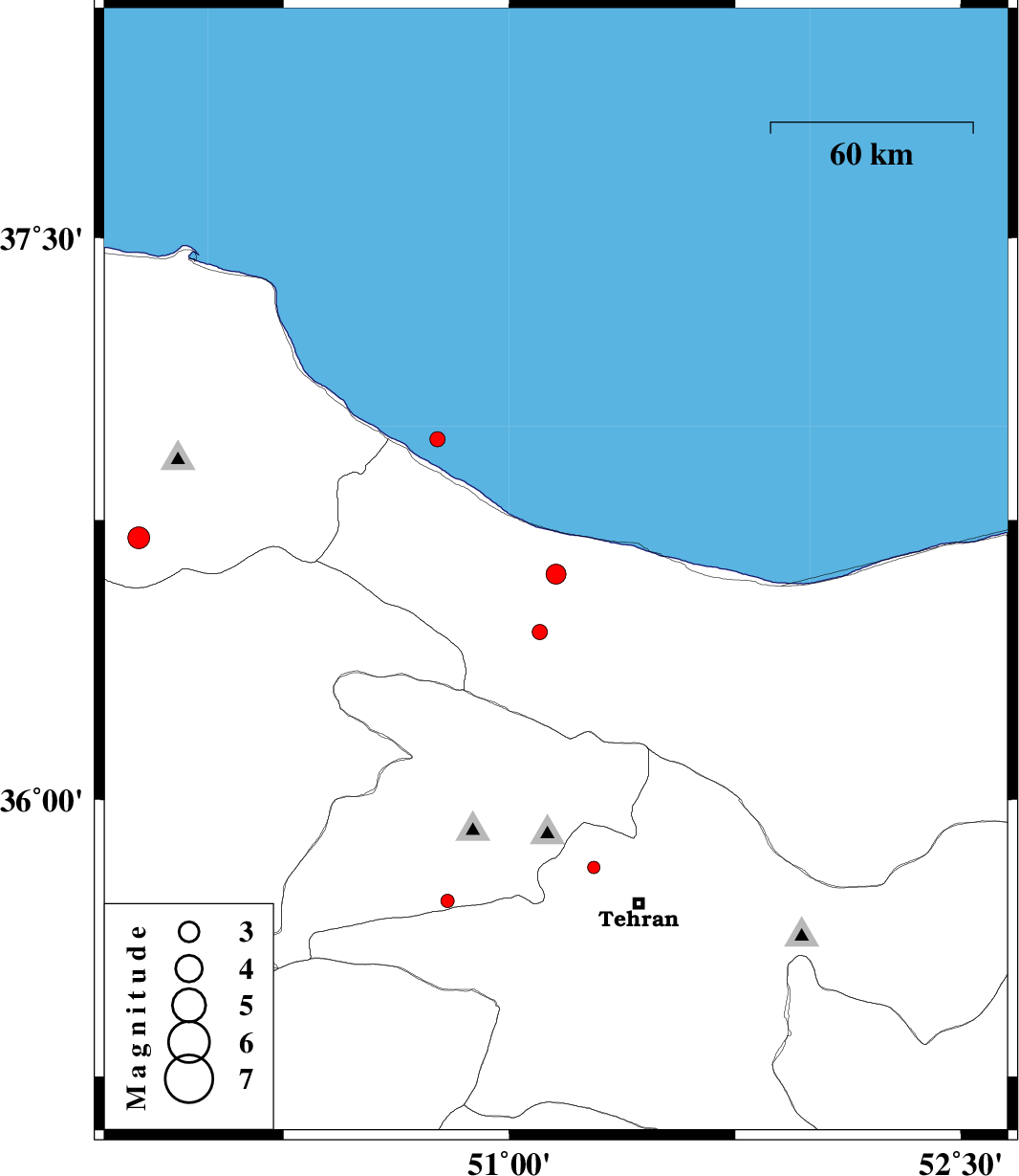 | 2018/10/01 | 03:16:03.2 | 06:46:03.2 | 36.965 | 50.761 | 14 | ML:2.2 | Caspian Sea, 12 km -East of Ramsar | ||