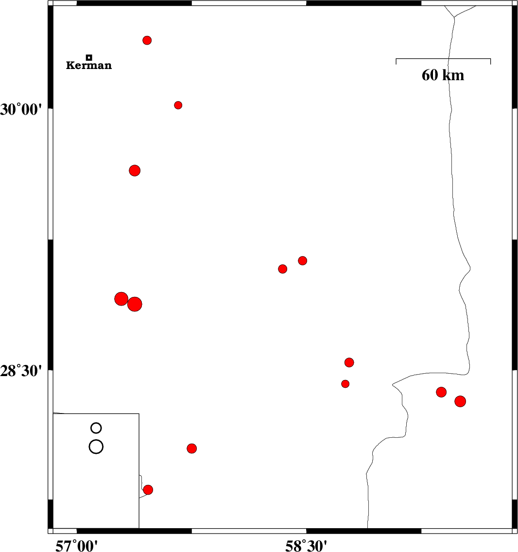 2018/10/14 | 14:21:12.2 | 17:51:12.2 | 30.017 | 57.661 | 14 | ML:2.3 | Kerman Province, 64 km South-East of Kerman | ||