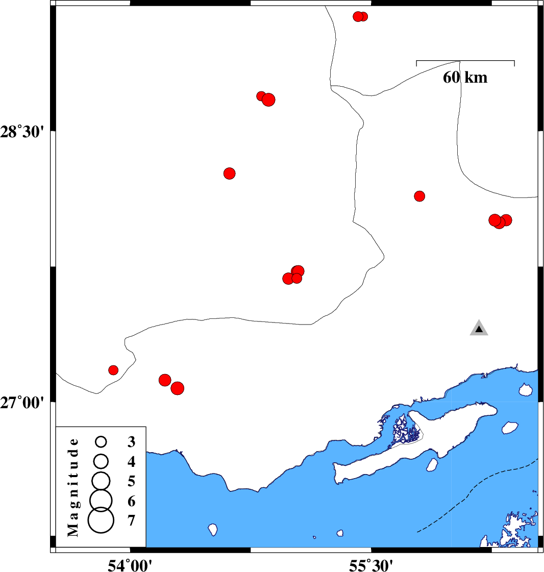 2018/09/16 | 17:10:57.5 | 21:40:57.5 | 28.008 | 56.339 | 14 | ML:3.3 | Hormozgan Province, 54 km South-East of Hajiabad | ||