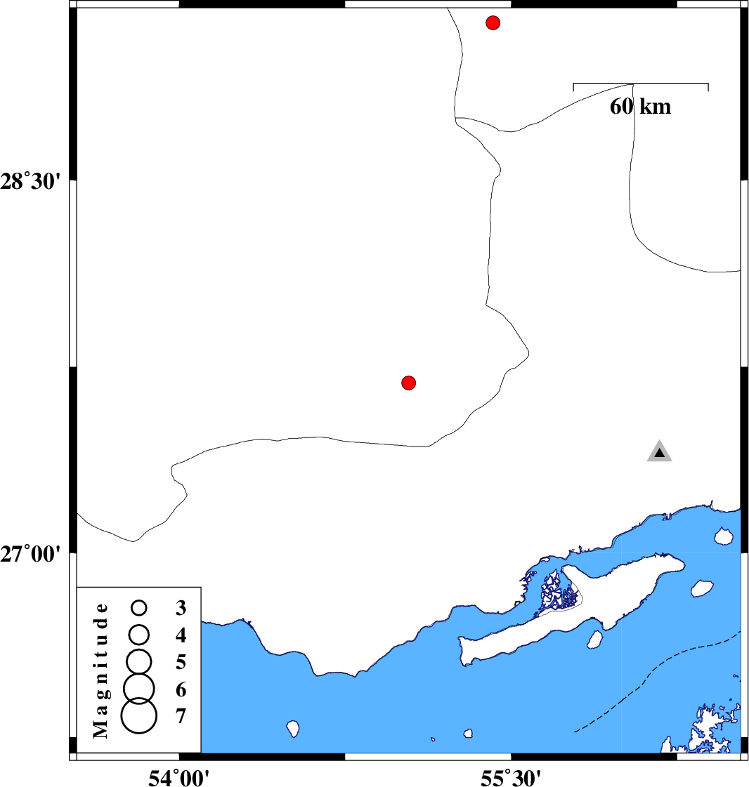 2018/10/09 | 11:12:04.3 | 14:42:04.3 | 29.126 | 55.418 | 14 | ML:2.8 | Kerman Province, 43 km South-West of Sirjan |