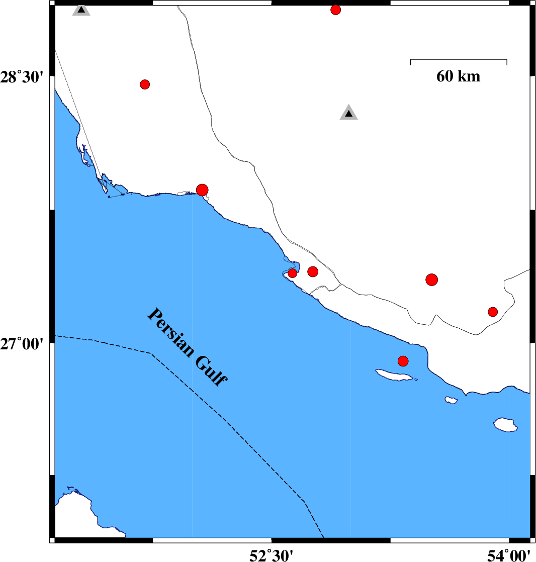 2018/10/01 | 08:40:53.9 | 12:10:53.9 | 27.402 | 52.76 | 14 | ML:2.9 | Bushehr Province, 20 km South-West of Mehr | ||