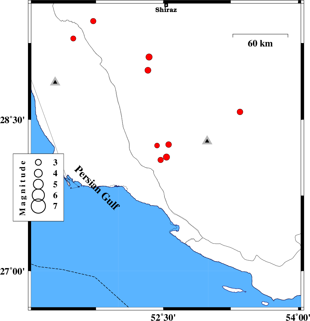 2018/10/06 | 01:23:57.1 | 04:53:57.1 | 29.215 | 51.265 | 15 | ML:3.7 | Bushehr Province, 8 km of Borazjan | ||