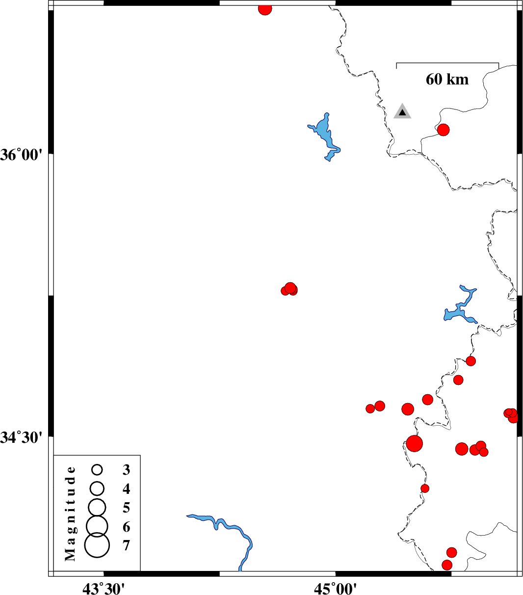 2018/10/09 | 09:42:19.2 | 13:12:19.2 | 34.697 | 45.596 | 14 | ML:3.1 | Iraq, 20 km North of Qasr-E-Shirin | ||